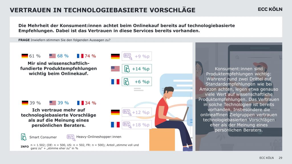 Jede:r dritte Konsument:in in Deutschland, Frankreich und den USA hat großes Vertrauen in technologiebasierte Empfehlungen beim Onlinekauf von beratungsintensiven Produkten. Das ist eines der Ergebnisse einer Studie des ECC KÖLN und Motesque, die die Relevanz wissenschaftlich fundierter Produktempfehlungen im Onlinehandel erfragt.